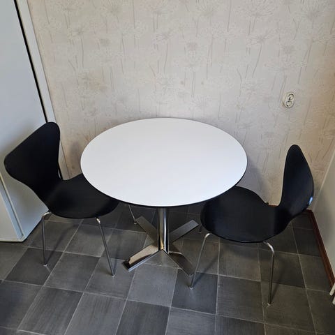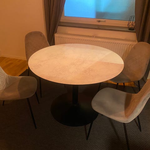 Svart runt bord. 100 cm i diameter. 74,5 cm högt. Bordsskiva i mdf och ben i metall. Lite repor i finishen men inget som har gått igenom färgen. Alltså intakt ytskikt.