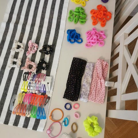Ett set med tre diadem för barn. Ett mörkblått med en rosett, ett lila med en fjäril och ett beigt med en svart rosett med guldstjärnor.