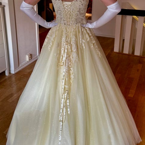 Balklänning i champagnefärg inköpt ny våren 2025 på Bröllopshuset Linköping. Storlek 42 med knytning i ryggen så storlek kan justeras. Längd på den som använt den är 164 cm + klackar. Nypris 8500 kr.