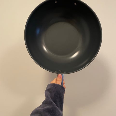 Säljer min stekpanna av kålstål, som har använda i två månader. Beläggningen på handtaget är något skadad.