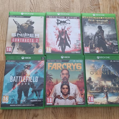 Ett Xbox med flertal spel och en handkontroll