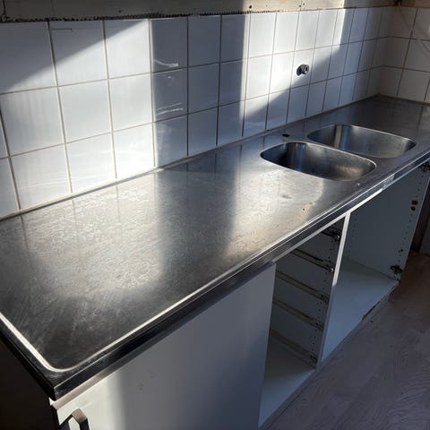 Liten diskbänk med hål för blandare. Avloppsrör saknas. Skåpet är i dåligt skick.