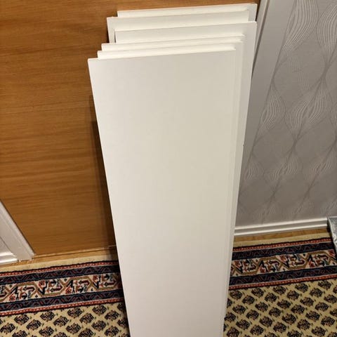 2 st Elfa backstativ ihopmonterade, H = 1750 mm, B = 550 mm, D = 550 mm. 9 st skohyllor, vitlackerad .