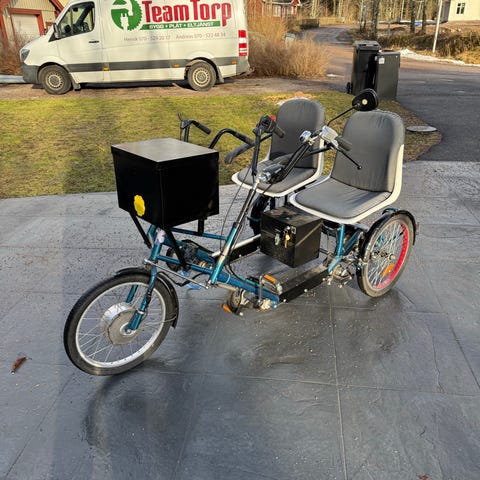 El-driven fyrhjuling söker nytt hem. Utmärkt för någon elektronisk/mekanisk projekt. Den original styrenhet [Heinzmann GmbH] har tyvärr “lagt av”, men den kan köras numera med en “start knapp” via 2 st. 12v reläer. Den har två lägen — sakta, dvs 24 volt och fullfart, dvs 36 volt. Men den borde ha en ny styrenhet som reglerar hastigheten via pedaler “för att cykla elcykel lagligt” på cykelbanan. Kan ju skaffas från Heinzmann m.m. Original manual finns. Motorn är helt OK. Nya däck fram.