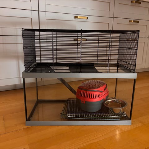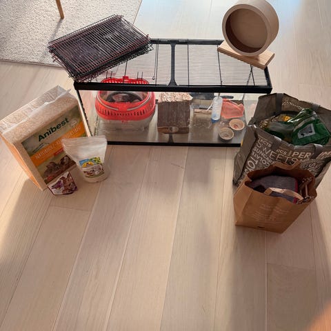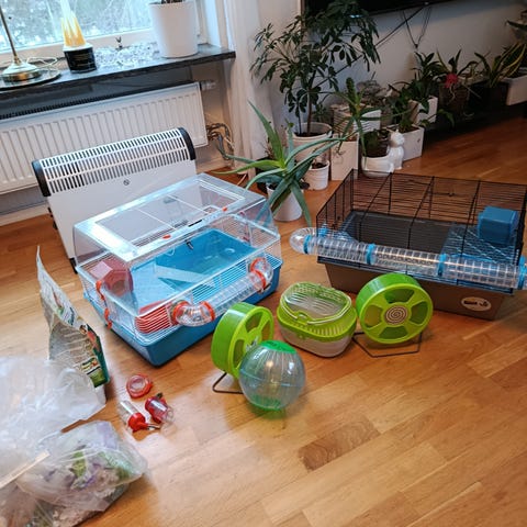 Stor hamsterbur med 2st trähus, hyllplan, stegar, matskål, sandskål, hamsterhjul, hage mm säljes