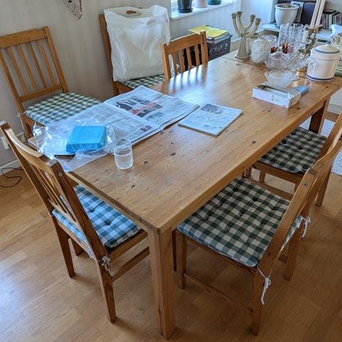 Säljer vårt fina matsalsbord med 6 stolar, inköpt på Mio. Normalanvänt men väl omhändertaget, bordskivan behöver bara slipas lätt och oljas in för att få en uppfräschning.