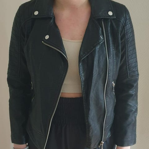 Snygg och stilren svart skinnjacka i bikerstil. Jackan har quiltdetaljer på axlarna, silverfärgade dragkedjor och en rak passform som ger en cool och tidlös look. Perfekt för både vardag och fest!