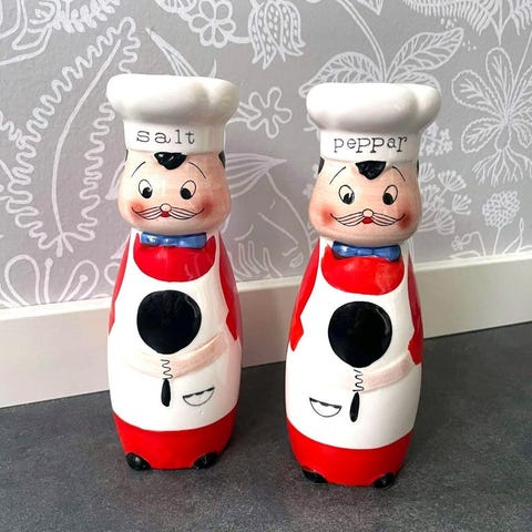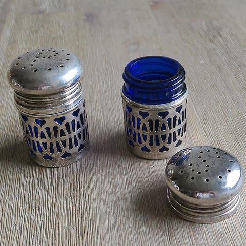 Vintage salt/pepparkar i mässing med blå och vit emalj.