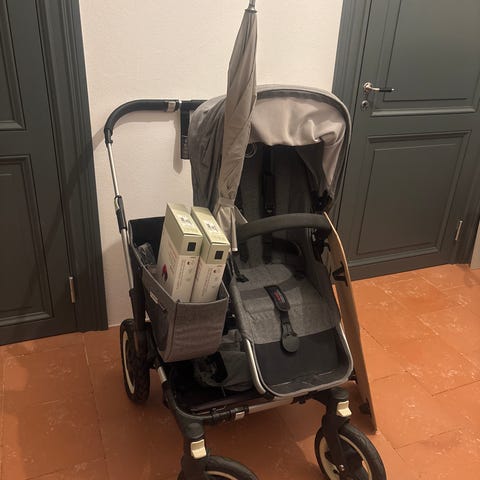 Bugaboo Donkey, svart och grå. Chassi helsvart från ca 2018, märken och skav förekommer. Övriga delar från ca 2020. Liggdelen mycket sparsamt använd. Alla tygdelar (förvaringskorg, sittdelar, liggdel mm) är tvättat. Vagnen är i fullt fungerande skick och har mycket kvar att ge. Mycket smidig vagn då den lätt anpassas till ett eller två barn. Lätt att fälla ihop och få liten för att få plats med i bil t ex. Framhjulen går att låsa.