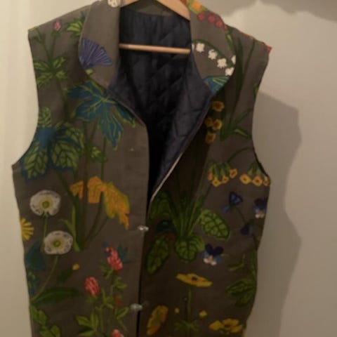 Vändbar jacka från Isabel Marant. Ena sidan har ett blommigt mönster i flera färger, medan den andra sidan är enfärgad i en ljusbrun nyans. Jackan har en krage, knappar framtill och två bröstfickor med knappar.