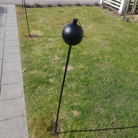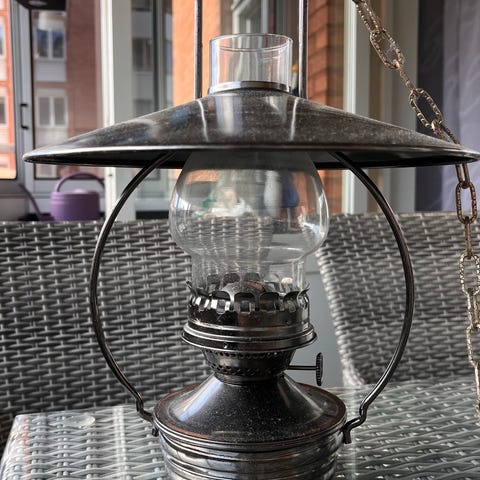 Säljer en helt ny oljelykta i modern design – svart metall med glascylinder och handtag upptill.