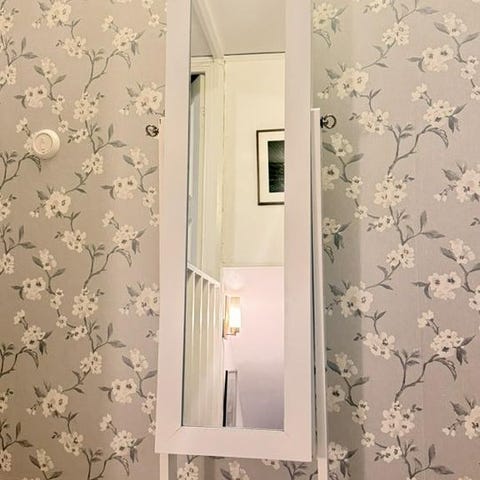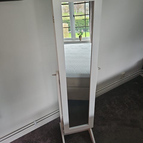 Spegelskåp i vitt med förvaring för smycken eller nycklar . Kan även hängas på väggen.