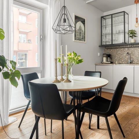 Svart linoleum. 140 cm. Mycket snyggt bord i dansk design. 6 pers får plats.
