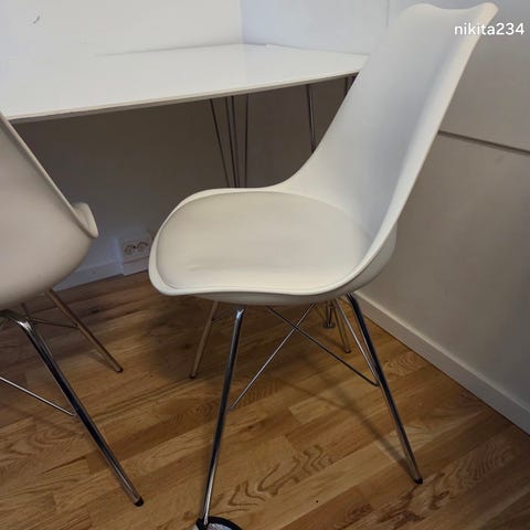 Matstolar i vit och svart baksidan. plast Attraktiva ben i krommetall i eiffelstil. Mycke bra skick , säljer alla 6 st till sammans för 1800
