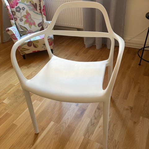 Brafab Delia karmstol, i ljusgrå/off-white design, mkt sparsamt använda och väl omhändertagna. Stapelbara, rekommenderat pris ny: cirka 1 395 kr/st, säljes för 1 000 kr styck.