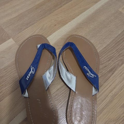 Ett par bekväma tofflor i en ljus beige färg. Perfekt för användning inomhus eller utomhus under varmare dagar. Tofflorna har en öppen design och en texturerad sula för bättre grepp.