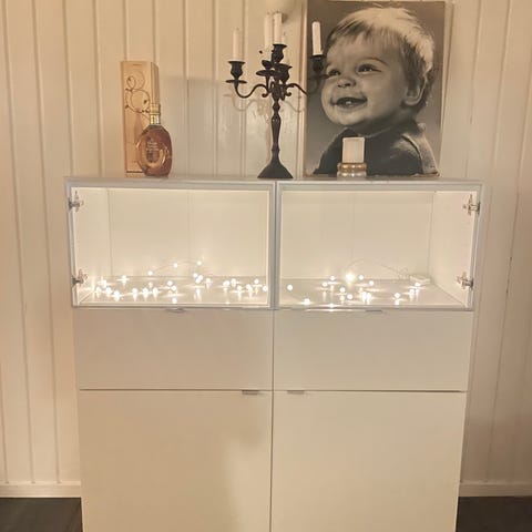 Vitt vitrinskåp med två glasdörrar och löstagbara hyllor. Två skåp och 4st lådor ger gott om förvaringsmöjligheter.