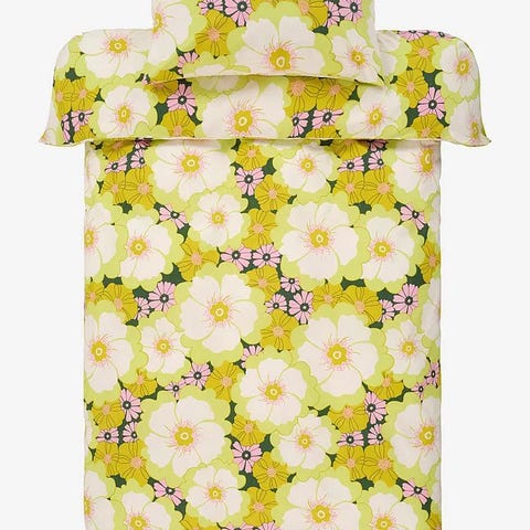 Ett fint påslakan med tillhörande örngott i retrostil. Blått rutmönster med inslag av blommor och gröna detaljer.
