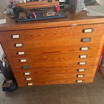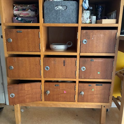 En gammal köpmansdisk/arkivskåp med 15 lådor. Enligt historien har den stått i en kyrka i och använts till att förvara biblar i lådorna. Sliten på ett snyggt sätt som sig bör. Används idag till förvaring av skor för hela familjen - men användningsområdena är oändliga.