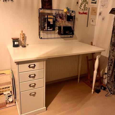 IKEA skrivbord i vitt med integrerad hyllsektion på ena sidan. Skrivbordet har en rak bordsskiva och tre öppna hyllplan för förvaring av böcker, pärmar eller annat kontorsmaterial. Passar som arbetsplats i hemmakontor, barnrum eller vardagsrum. Bordet är fristående och kan placeras mot vägg eller fritt i rummet beroende på behov.