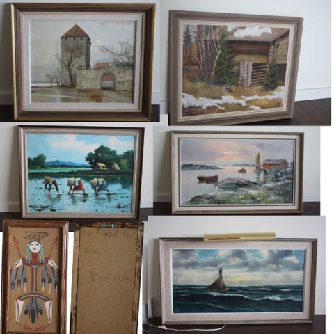 Tre tavlor, 150kr för alla. ”Huset” ca 36cm x 28cm ”Ljusstake” 41cm x 33cm ”Landskap” 52cm x 41cm