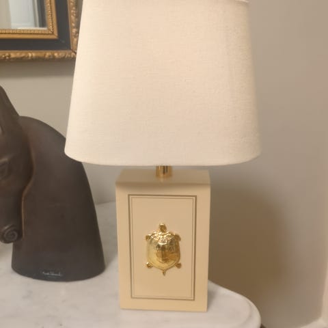 Grå lampskärm i sammet. Lampan är i fint skick, på insidan av skärmen finns ett veck, inget som syns utifrån. Skärmen kan också bytas ut om man föredrar en annan. I övrigt är den i mycket fint skick. Svart sladd med tryckknapp. Ca 58 cm bred, 13 cm djup. Lampskärm ca 28 cm diameter.