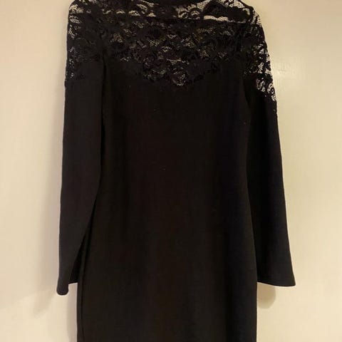 Supersnygg svart kortklänning från Bodyflirt med spets upptill och halvtransparenta trekvartsärmar. Kjolen är slät och faller fint. Toppen har blommigt spetsmönster och v-ringning framtill. Perfekt för dig som vill sticka ut lite extra!