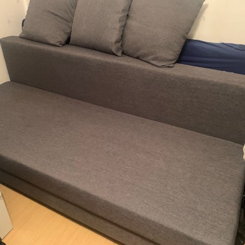 Då vi har flyttat har vi nu ingen plats för soffan. Vi piffade upp soffan med klädsel, bäddmadrass o kuddar o den blev faktiskt mycket skön att sitta i. Allting följer med förutom bäddmadrassen