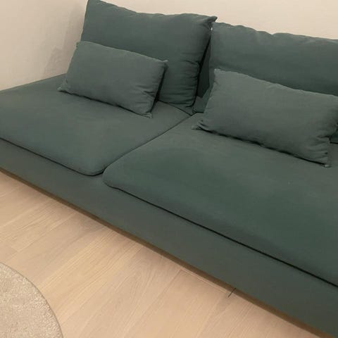 Bild 1 visar klädselns tyg och färg i mörkgrått/antracit medan bild 2 visar formatet (ej färgen).