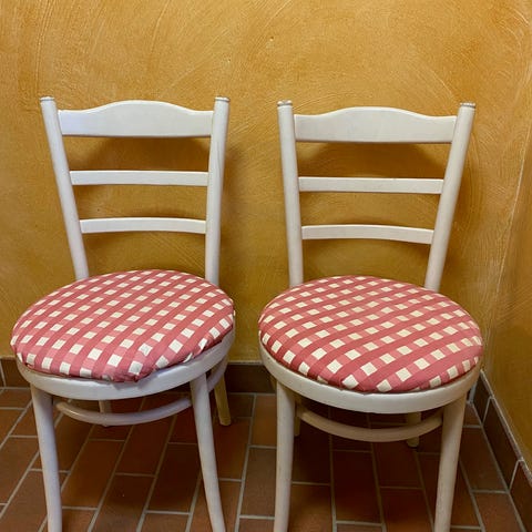 Helt ny klassisk vit stol i modernt utförande, sits i grått tyg med ett kryss överst i stolsryggen. Komplettera de stolar du redan har eller köp denna stol och ytterligare stolar i butik efter behov.