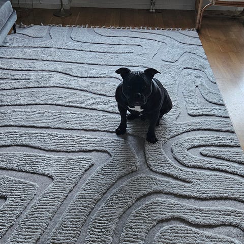 Ca 190 × 75 cm. Lite längre med fransarna. Mattan är lite mer mörkrosa, mer gammelrosa än bilderna visar! Oanvänd.