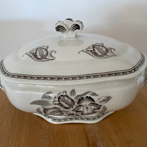 Vacker italiensk dekorativ skål med lock, tillverkad av porslin, med detaljerade reliefer, keruber och motiv i guld.