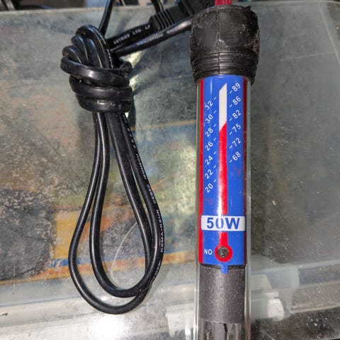 Akvarie tillbehör. En ledlampa, vattenvärmare och städ tillbehör.