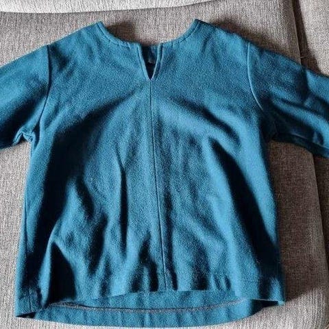 Ljusblå långärmad tunika med v-hals och detaljer i en ljusare nyans runt halsen. Tunikan har en avslappnad passform och slitsar i sidorna.