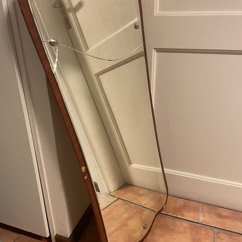 Fin helkroppspeget i brunt trä. Osäker på vad det är för träslag. Teak? Mahogny? Eller om det är annat träslag som är betsad. Osäker på det. Fin är den i alla fall och i bra skick!