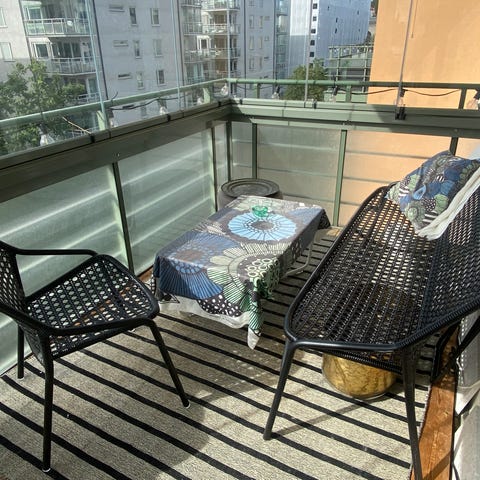 Soffa och fåtölj ”Cello Bali” i slitstark flätad polyrotting. Möblerna har stått skyddade på inglasad balkong under en halv säsong och använts mycket sparsamt. Ramen kan rengöras med tvål och vatten och dynornas klädsel kan tas av och tvättas. Säljes pga flytt. Nypris för soffa och fåtölj 8500kr.