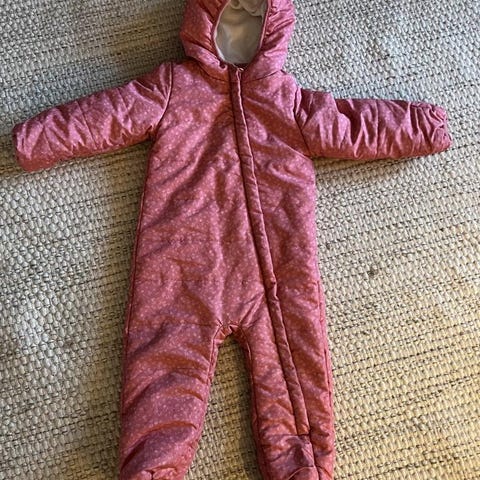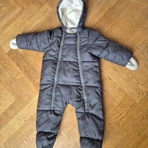 Avtagbara tassar och inbyggda handskydd. Storlek 9=12 månader enligt etikett.
