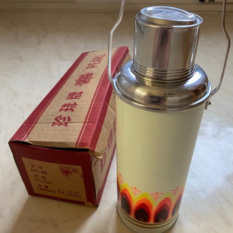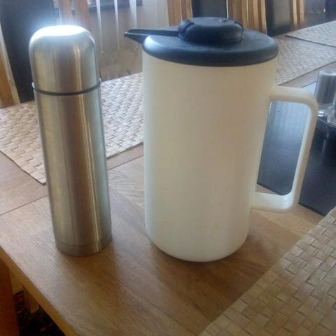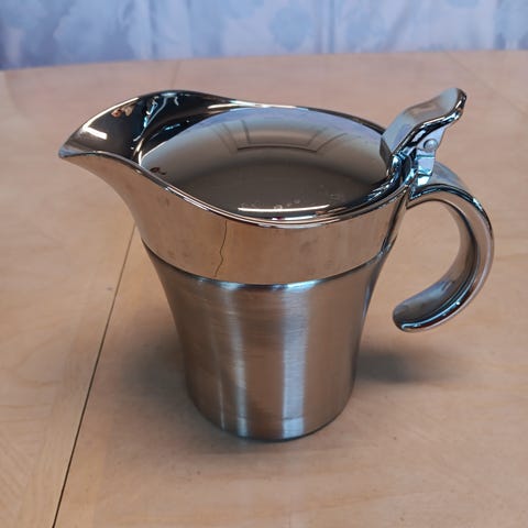 Glas invändigt. Håller värme länge. Volym 1 liter.