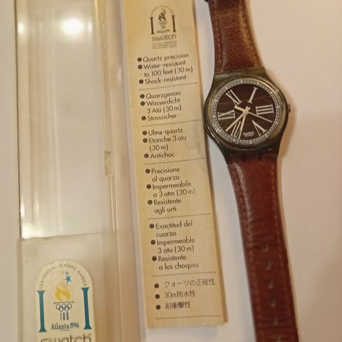 Swatch herrklocka med svart urtavla och tre mindre urtavlor. Klockan har ett svart och blått randigt nylonband. Designen är sportig och klockan är avsedd för män.