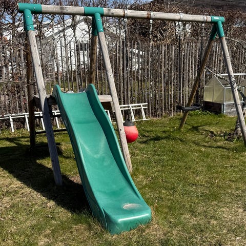 Innehåll: 1 x Vågformad rutschbana, 1 x Gungställning, 1 x Enkel gunga