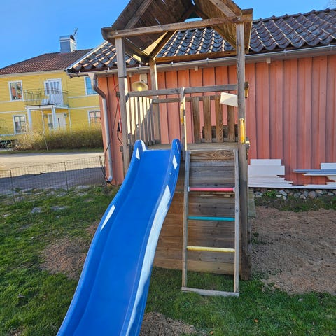 Helt ny oanvänd lekplats med gungställning och rutschkana, se röda ringarna på bild 2. Träställningen ingår ej. Du monterar själv ställningen och kanan på passande ställe eller bygger ett torn för montering. Varje produkt har bruksanvisning.