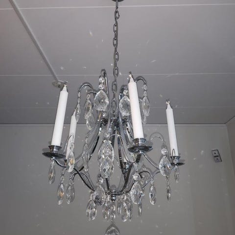 Fin lampa med glasdetaljer och vita glasdroppar. Funkar och har en diameter på ca 50 cm och höjd på ca 55-60 cm.