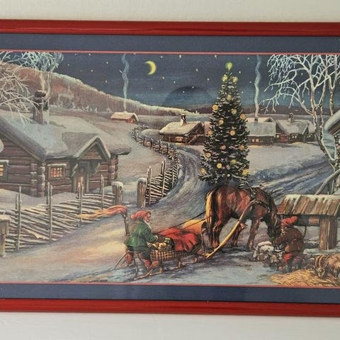 Tryck på papp, inramad och inglasad i röd ram.