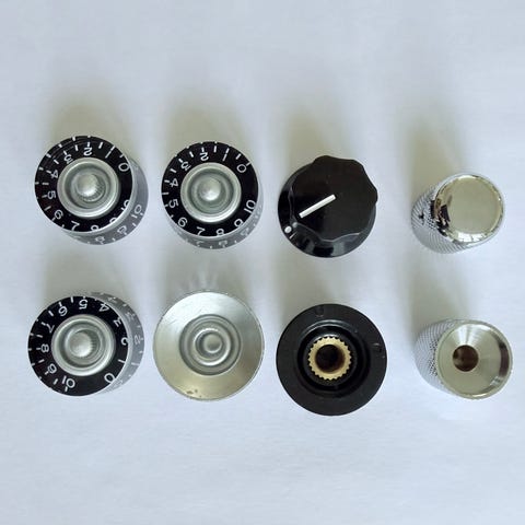 För över två år sedan fick jag då min Silverface Dual Showman Reverb topp ombyggd till 1960-63 års 6G14-A Brownface-specifikationer. Nu håller jag på att ändra utseendet på kabinettet och sånt. Den här kompletta uppsättningen med originalrattar och spill på tygkablar, RCA-uttag för reverbet, kolmotstånd osv kan kanske tilltala någon som håller på att restaurera/bygga om sin förstärkare? En av rattarna är något skadad, se bild, annars är de alla i utmärkt skick.