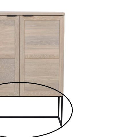 Bakom skjutdörrarna med ribbat mönster av massiv ek finns förvaringsutrymme. Den höga benställningen av pulverlackerad metall i sandstruktur ger en luftig känsla i rummet.