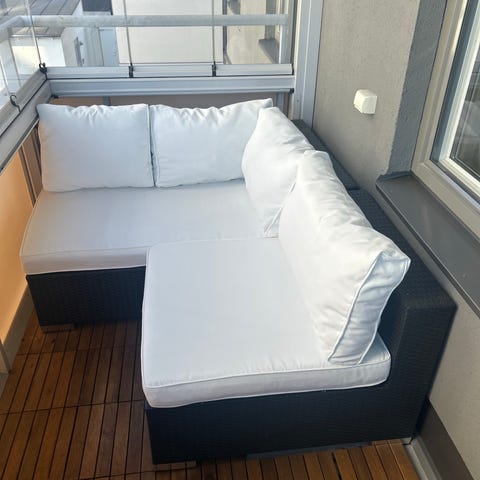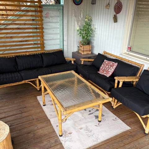 Vi köpte möblerna begagnade 2011 (troligen 1980/90-tal) och dynorna köptes samtidigt nya 2011 och har i alla år stått inomhus i relaxdelen i vårt poolrum. Mycket sparsamt använda, möblerna i bra skick och dynorna i princip i nyskick, inget solblekt eller utsatt för väder och vind. Gruppen laserades i mörkbrunt när vi köpte den och den är lika fin fortfarande.