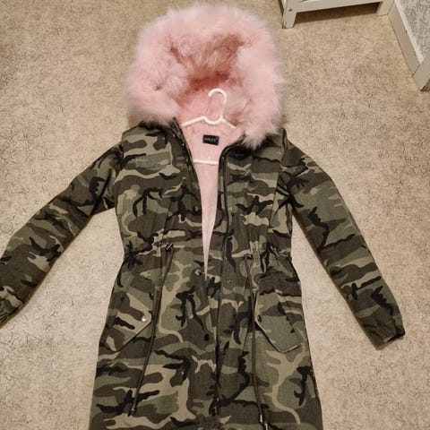 Jacka med huva, kamouflage, märke Addict. Storlek S. Använd. Bra skick.