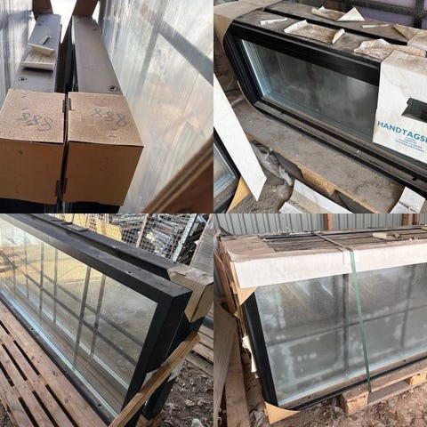 Nya alubeklädda 3-glas fönster, solskyddsglas, svart utsida, vit insida. Bredd 480mm, höjd 1480mm.