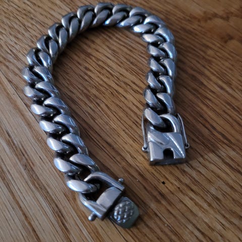 Ett tungt och stilrent armband med grov pansarlänk i silverfärgad metall. Robust design som passar både vardag och fest. Försluts med rejäl klämhake.