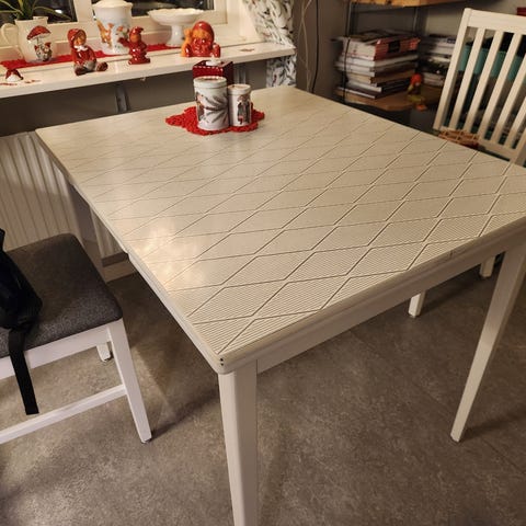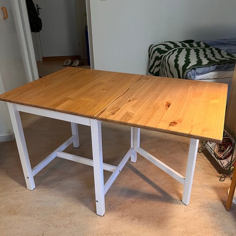 Fint litet matbord som passar perfekt i den lilla lägenheten eller studentrummet. Tidigare slagbord men har tagit bort uppfällningsskivorna. Låda undertill med plats för förvaring. Är nött och skulle behöva lite kärlek i form av slipning och målning, men är stabilt och i bra skick i övrigt.